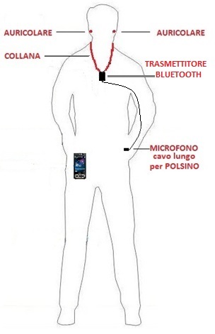L’antenna a collana induttiva è collegata ad una piccolissima centralina contenente un sensibile microfono ed un trasmettitore Bluetooth per il collegamento wireless a qualsiasi cellulare che si dovrà tenere in tasca o nascondere nella borsa o cartella.