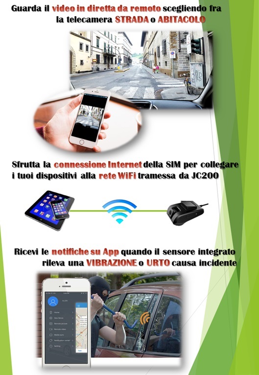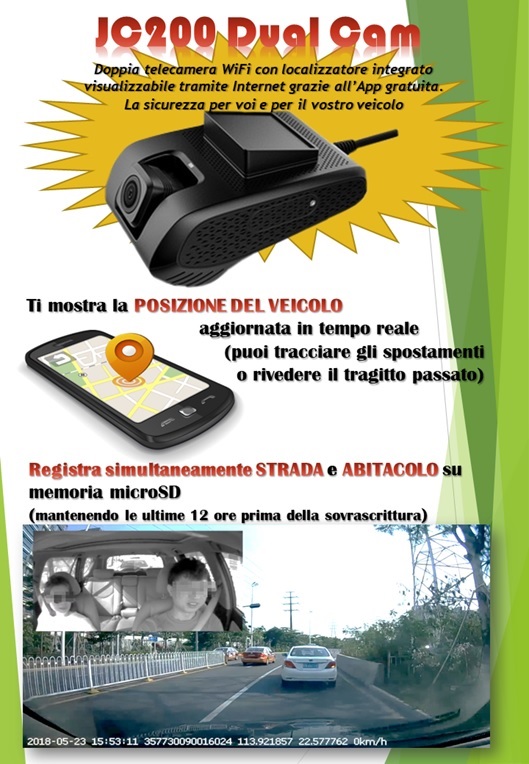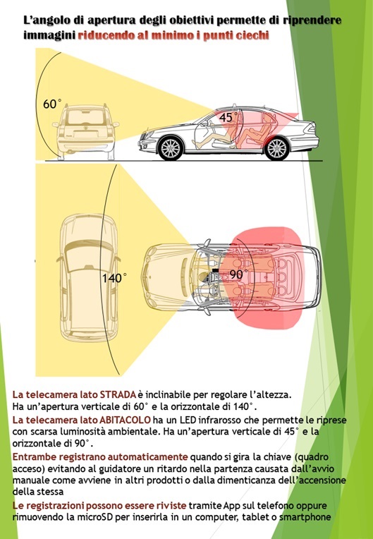 Questo dispositivo completo di due telecamere ad alta risoluzione permette di registrare in automatico all’accensione dell’auto o su comando di registrazione manuale tramite il cellulare; dallo stesso è possibile vedere in diretta oppure visionare quanto precedentemente registrato.