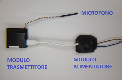 il microfono su cavo lungo 8 cm sarà pizzicato tra il telaio e la placca mentre i due moduli della microspia saranno fuori dalla scatola elettrica (nel muro).
