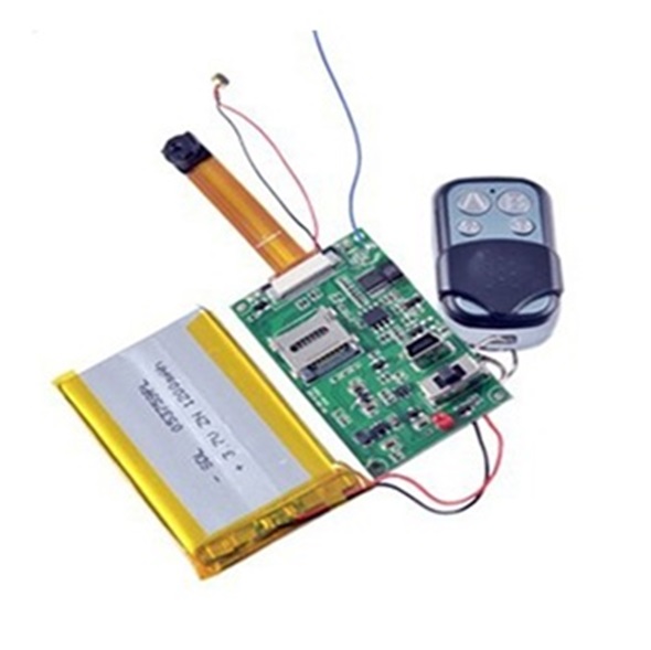 Telecamera con registratore audio e video in esecuzione nuda, priva di qualsiasi involucro, pronta per esser occultata in un qualsiasi oggetto, l’obiettivo è fissato su un flat-cable lungo 5 cm.