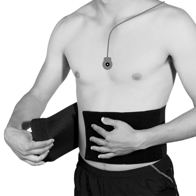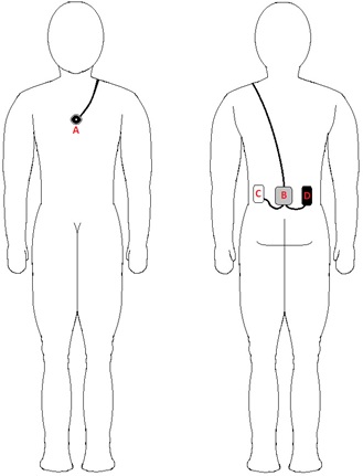 - L’obiettivo [A] viene posizionato frontalmente sulla zona centrale del petto, fissato mediante cerotto farmaceutico.