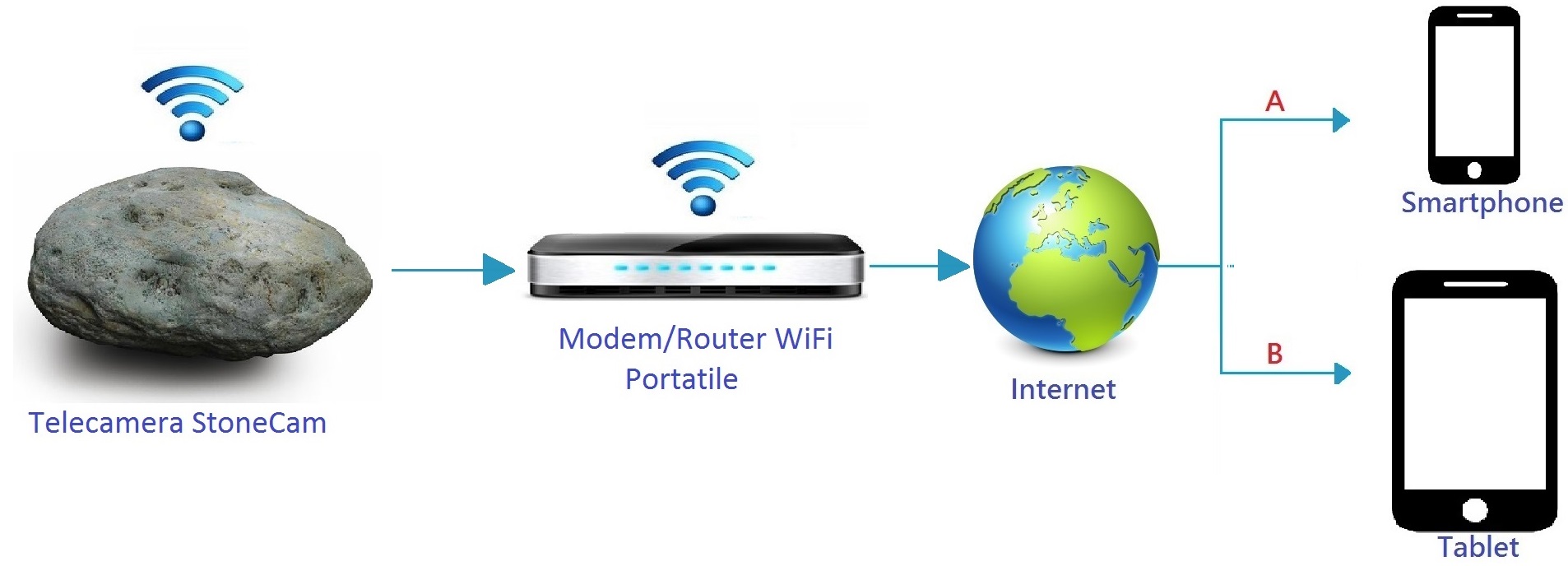 in una finta PIETRA è inserita una telecamera wifi, completa di batterie, in grado di trasmettere le immagini ad un MODEM router lasciato nelle vicinanze; quest’ultimo ritrasmette in internet quanto ripreso dalla telecamera.